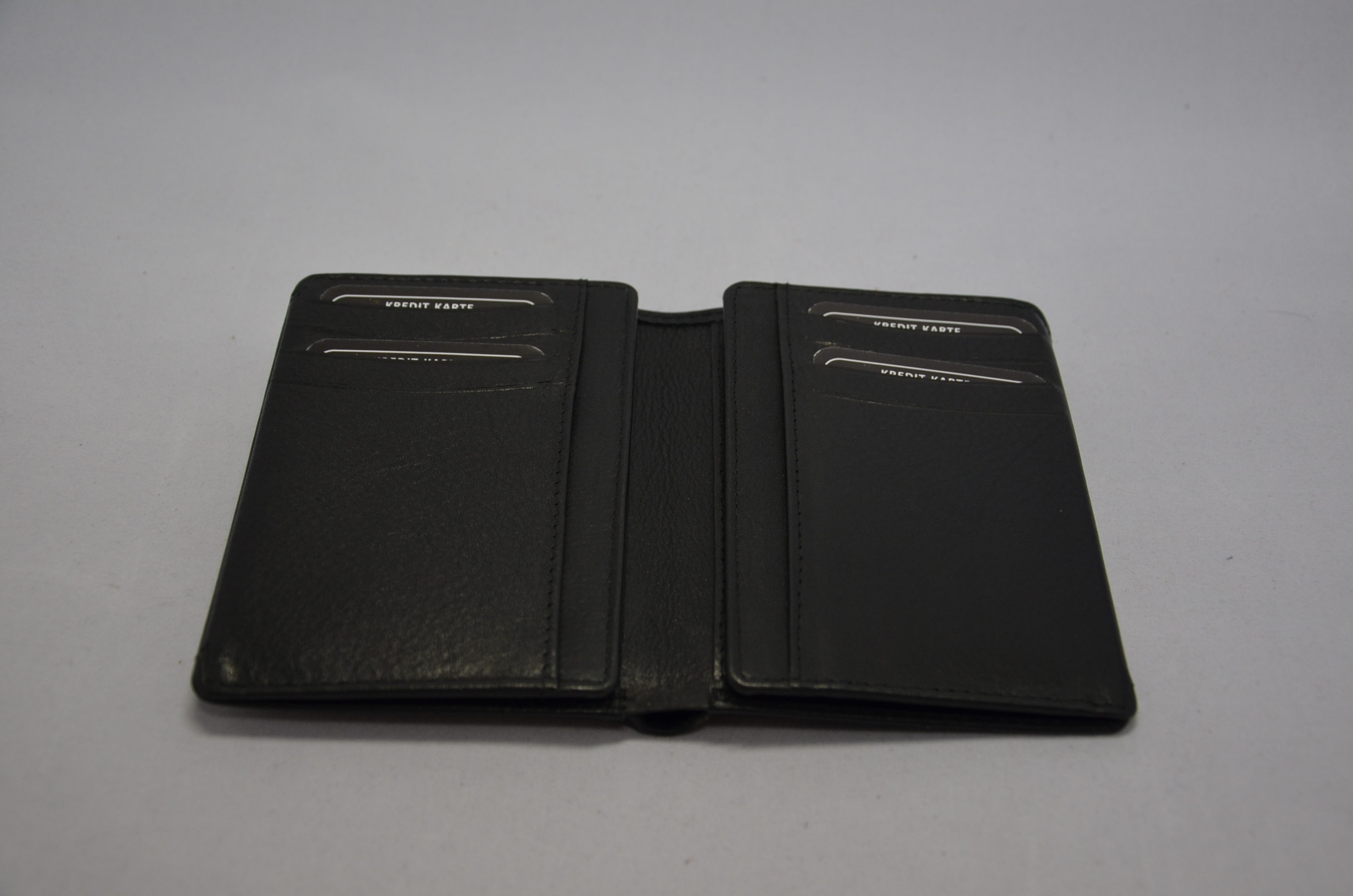Beim Aufklappen schauen Sie auf zwei Seiten mit jeweils Platz für 4 Karten im EC-Kartenformat. Darunter befindet sich Platz für zwei weitere Karten, Notiz-Zettel oder dergleichen. Beim Aufklappen der linken und rechten Seite blicken Sie erneut links und rechts auf zwei aus Leder bestehende Seiten, die wiederum Platz für jeweils 4 Karten im EC-Kartenformat. Auch hinter diesen beiden EC-Karten Fächern finden Sie Platz für sowie auf zwei durchsichtige Fächer in denen der "alte" Personalausweis, Fahrzeugschein oder der rosafarbene Führerschein Platz findet.