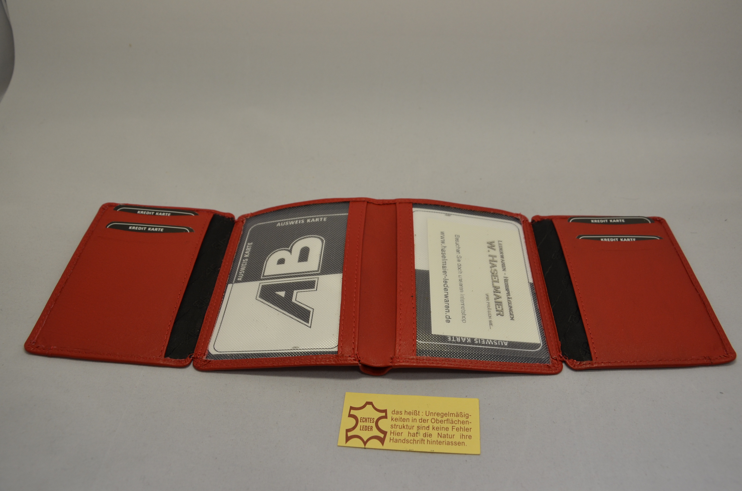 Beim Aufklappen schauen Sie auf zwei Seiten mit jeweils Platz für 4 Karten im EC-Kartenformat. Darunter befindet sich Platz für zwei weitere Karten, Notiz-Zettel oder dergleichen. Beim Aufklappen der linken und rechten Seite blicken Sie erneut links und rechts auf zwei aus Leder bestehende Seiten, die wiederum Platz für jeweils 4 Karten im EC-Kartenformat. Auch hinter diesen beiden EC-Karten Fächern finden Sie Platz für sowie auf zwei durchsichtige Fächer in denen der "alte" Personalausweis, Fahrzeugschein oder der rosafarbene Führerschein Platz findet.