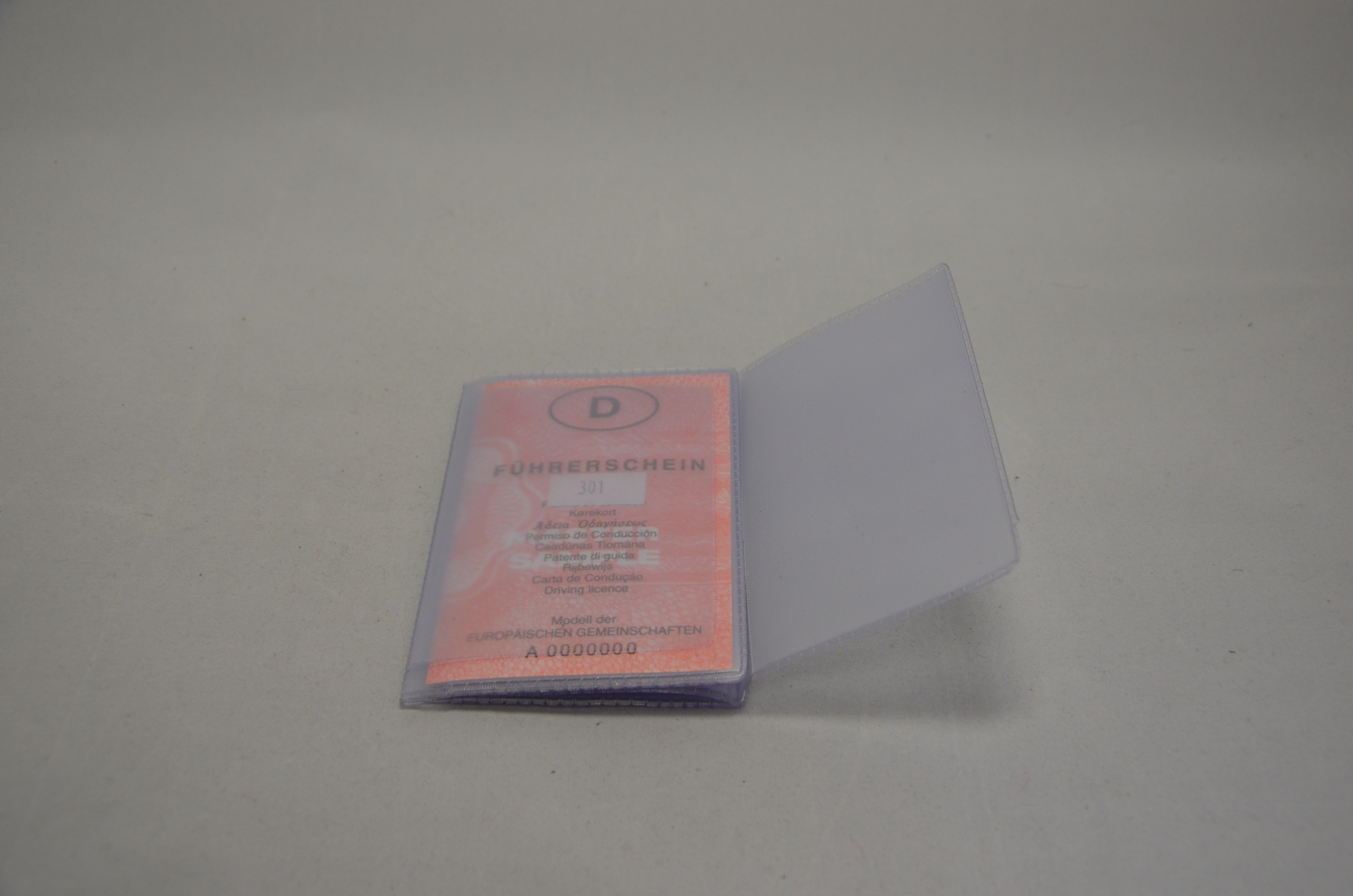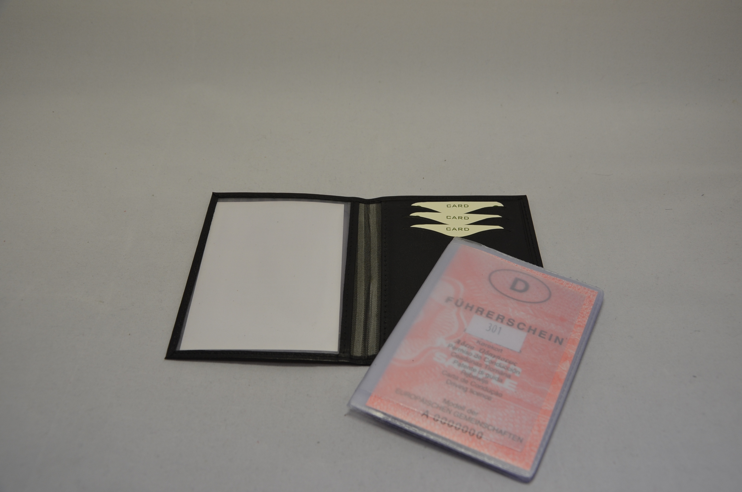 Auf der anderen Seite hat das Ausweismäppchen eine Front aus Leder, auf deren Rückseite im Inneren sind 3 Einsteckfächer für EC-Karten. Auf deren Innenseite ist ein Plastikeinsatz, der auch auch der anderen Seite, sprich dort wo sich der Ausweis befindet, eingesteckt ist. In den austauschbaren Plastikeinsatz passen 5 Ausweise im Format des Fahrzeugscheines, des rosafarbenen Führerscheines,... sowie ein doppelte Einschubfach.