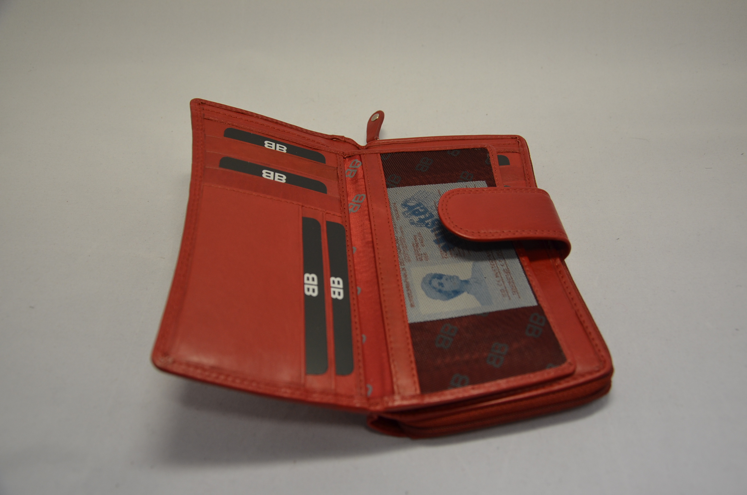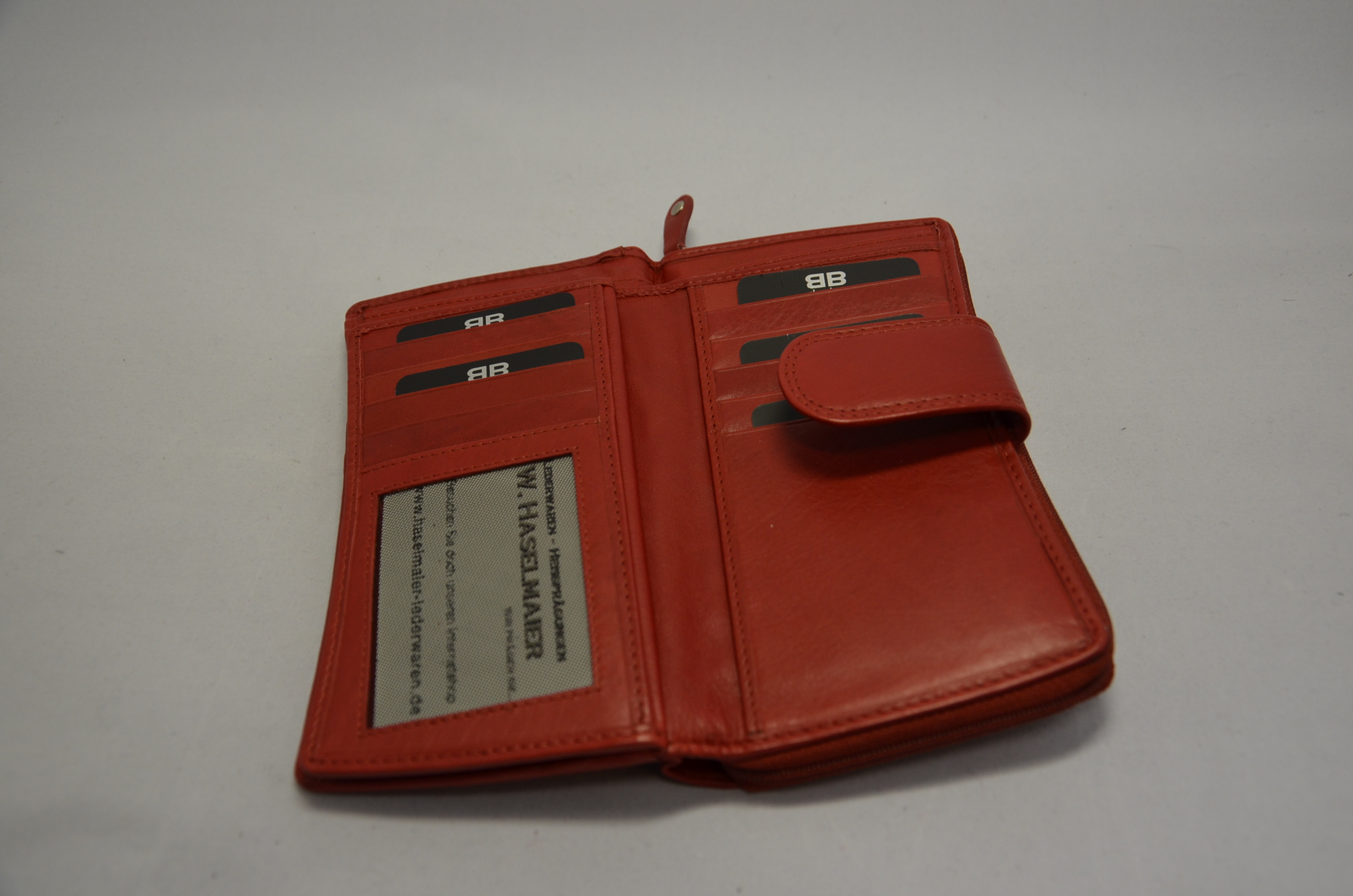 Die Außennähte sind mit Doppelnähten gefertigt. Beim Öffnen des Druckknopf, der eine zweite Schließmöglichkeit besitzt und damit eine Dehnung ermöglicht, finden Sie zwei Scheingeldfächer, die tief nach unten gehen und Ihre Geldscheine so sicher verwahrt. Des Weiteren befinden sich insgesamt 18 Einsteckfächer für Karten im EC-Format und ein Netzfach für Notizen oder auch Ihren Fahrzeugschein sowie zwei weitere Fächer unter den Steckfächern.