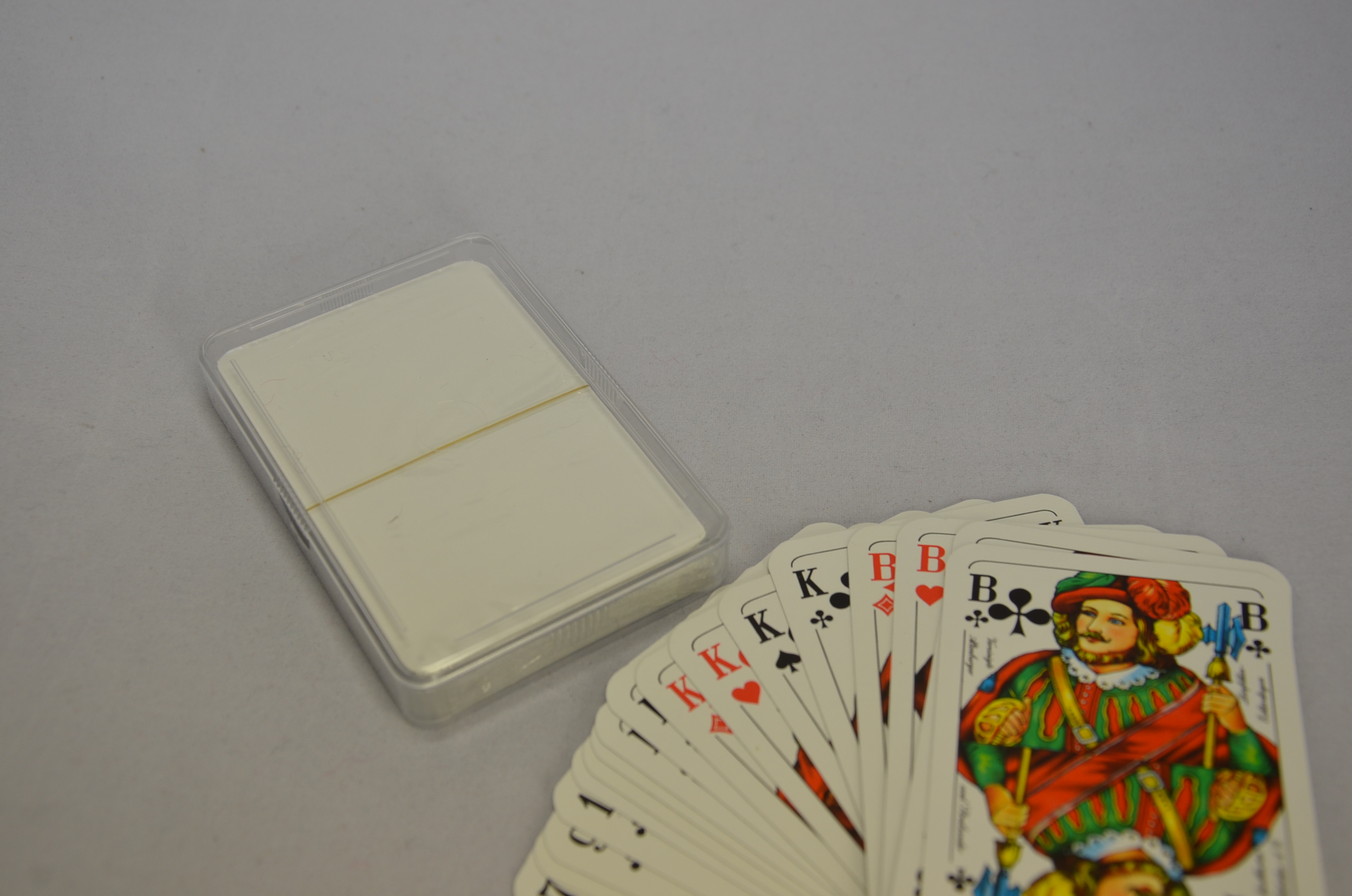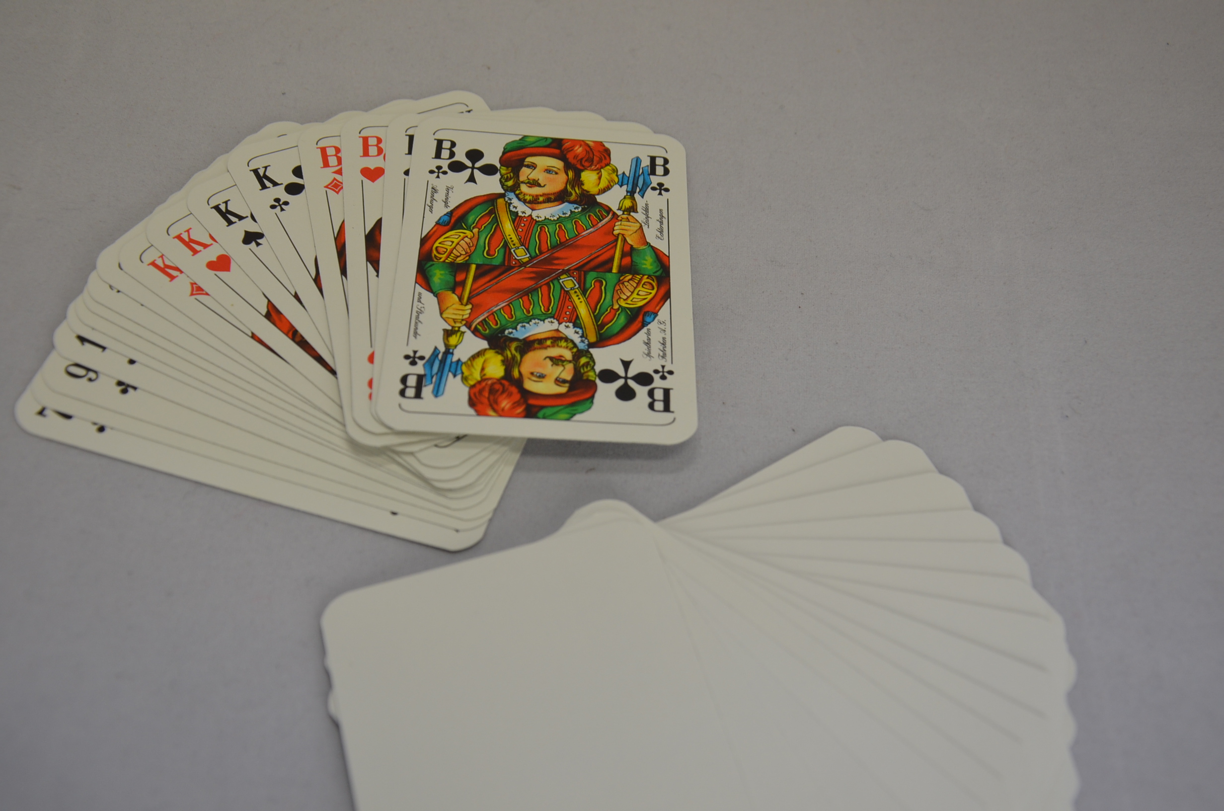 Dieses Skatkartenspiel mit französischen Bild, hat 32 Blatt und eine neutrale weisse Rückseite, ohne Rand.