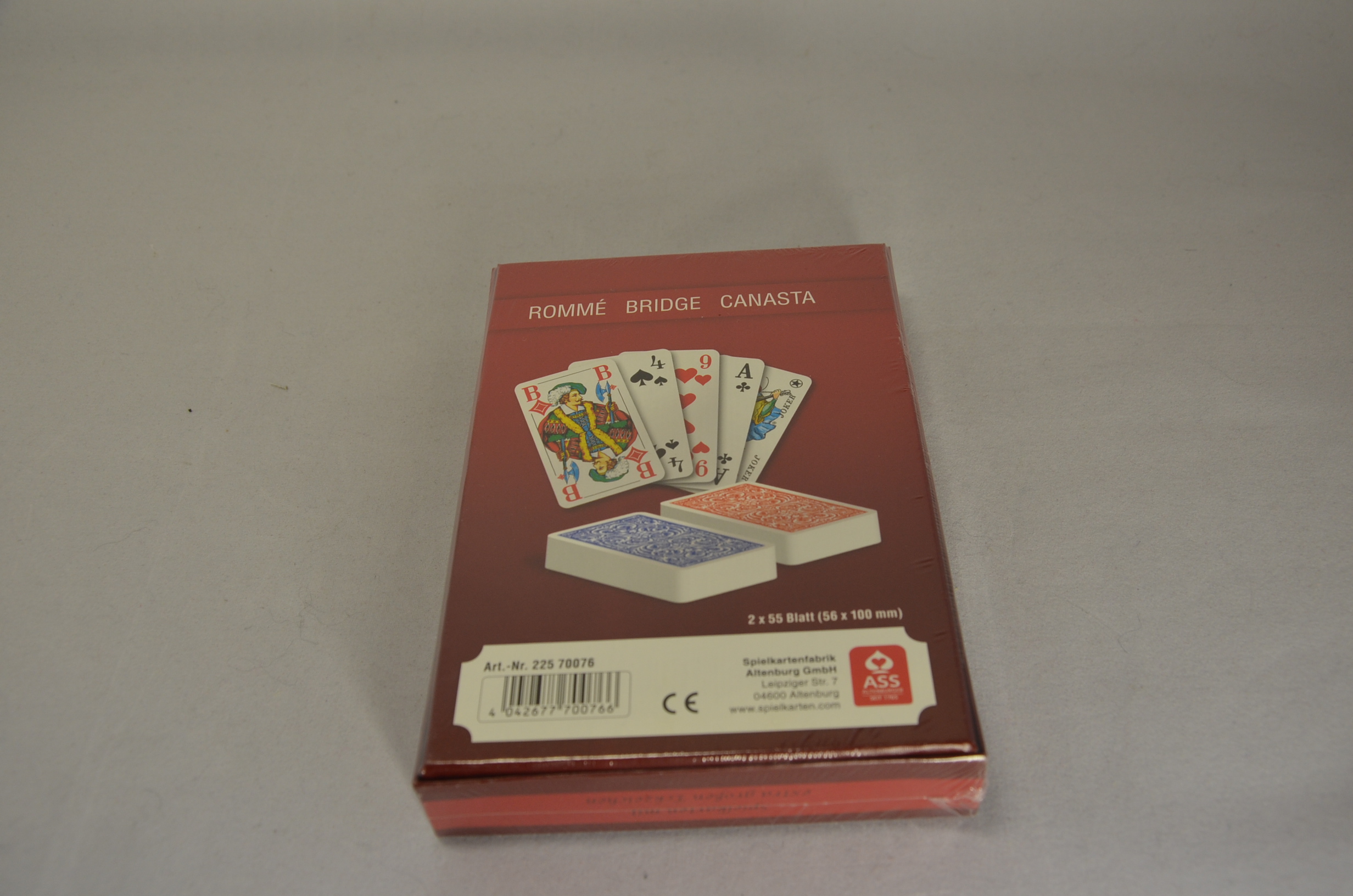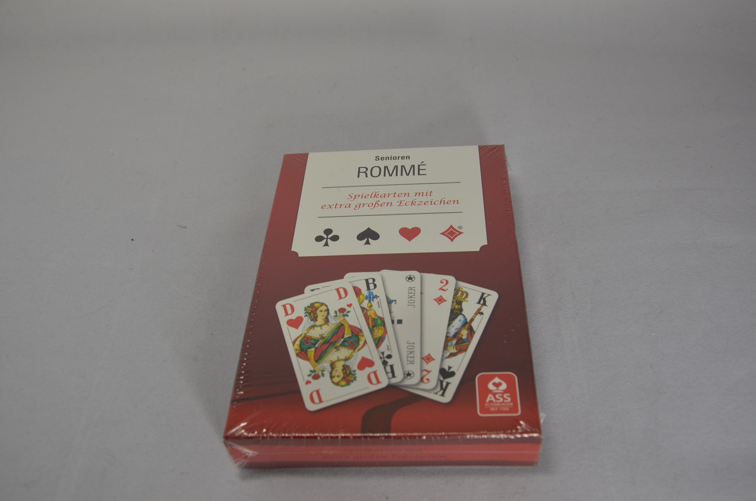 Mit diesem Seniorenkartenspiel aus dem Hause ASS können Sie Rommé, Bridge und Canasta spielen. Es hat 110 Blatt, mit jeweils 55 Karten mit einer roten und dunkelblauen Rückseite mit Ornamentverzierungen und extra großen Eckzeichen. Wir prägen auf jede einzelne Spielkarte Ihre Namens- oder Initialienprägung.